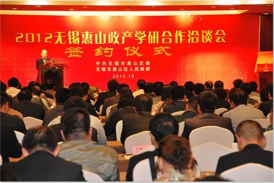 10月25日,2012無錫惠山政產學研合作洽談會簽約儀式在華美達廣場酒店隆重舉行,區領導吳仲林、顧中明、顧智杰、陳燕、方瑛、曹文彬出席簽約儀式。區委書記吳仲林作講話,代區長顧中明致辭,簽約儀式由副區長曹文彬主持。
