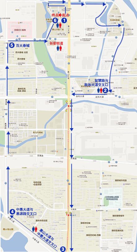 線路安排如下:起點①(無錫(惠山)生命科技產業園→致遠路→啟航路→研園路→荷塘路→華清創業園(荷塘路與力合路交叉口)→荷塘路與智慧路交叉口→智慧路與堰新路交叉口→智慧路(0-Park)→站點②數字信息產業園(智慧路與政和大道交叉口)→政和大道→政和大道與惠山大道交叉口(地鐵1號線)→惠山大道→惠山大道與金惠路交叉口(惠山區全民健身中心)→惠山大道與華惠路交叉口(錫北運河站)→站點③錫北運河(惠山大道與中惠大道交叉口)→中惠大道→站點④華府莊園(中惠大道與惠源路交叉口)→惠源路(高力汽博城)→奧林匹克(惠源路與政和大道交叉口)→惠源路與文惠路路交叉口→站點⑤春城花園(惠源路與堰新路交叉口)→堰新路(中央公園)→堰新路與致遠路交叉口(科創中心)→致遠路→終點⑥(無錫(惠山)生命科技產業園)