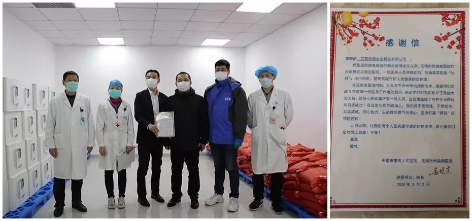 2020年2月2日,入園企業-江蘇潔澄水業科技有限公司,由企業董事長親自帶隊親臨無錫醫護一線,給抗擊疫情的醫護工作人員送上健康飲用水,合計向無錫市人民醫院和無錫市第五人民醫院捐贈400袋純凈袋裝水和200臺即熱式飲水機。除此以外,企業負責人表態將根據各醫院的用水情況,持續捐贈至疫情結束。