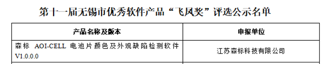 根據《市政府關于印發無錫市優秀軟件產品“飛鳳獎”申報評選辦法的通知》(錫政發〔2015〕52號)文件精神,市工業和信息化局組織開展了第十一屆無錫市優秀軟件產品“飛鳳獎”的評選工作。在企業申報及市(縣)、區產業主管部門推薦的基礎上,經初審、復審、銷售審計、質量評測和專家評審,江蘇森標科技有限公司的“森標 AOI-CELL 電池片顏色及外觀缺陷檢測軟件V1.0.0.0 ”軟件產品成功入圍第十一屆無錫市優秀軟件產品“飛鳳獎”,此次入圍的軟件產品共10個。