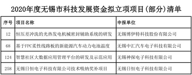根據(jù)《關于加快實施創(chuàng)新驅動核心戰(zhàn)略的若干政策措施》(錫委發(fā)〔2017〕70號)、《關于深入實施創(chuàng)新驅動核心戰(zhàn)略加快建設科技創(chuàng)新高地的若干政策措施》(錫委發(fā)〔2018〕53號)以及《無錫市科技發(fā)展資金管理實施細則》等文件的規(guī)定,經(jīng)組織申報、形式審查、專家評審、信用查詢、黨組會審議等程序,入園企業(yè)無錫博伊特科技股份有限公司、無錫中匯汽車電子科技有限公司、無錫神探電子科技有限公司、無錫日恒電子科技有限公司的項目成功入選2020年度無錫市科技發(fā)展專項資金擬立項項目。