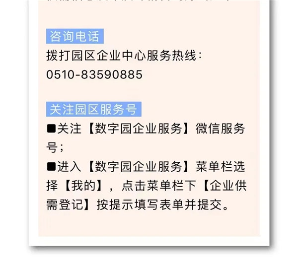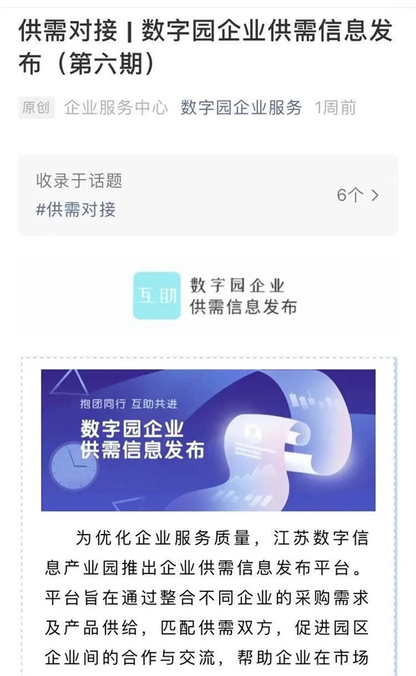 為優(yōu)化企業(yè)服務(wù)質(zhì)量,數(shù)字園推出企業(yè)供需信息發(fā)布平臺。平臺旨在通過整合不同企業(yè)的采購需求及產(chǎn)品供給,匹配供需雙方,促進園區(qū)企業(yè)間的合作與交流,幫助企業(yè)在市場推廣、技術(shù)支持、項目聯(lián)動等方面拓寬渠道,實現(xiàn)信息共享及資源整合。目前供需發(fā)布已在數(shù)字園企業(yè)服務(wù)公眾號發(fā)布六期。